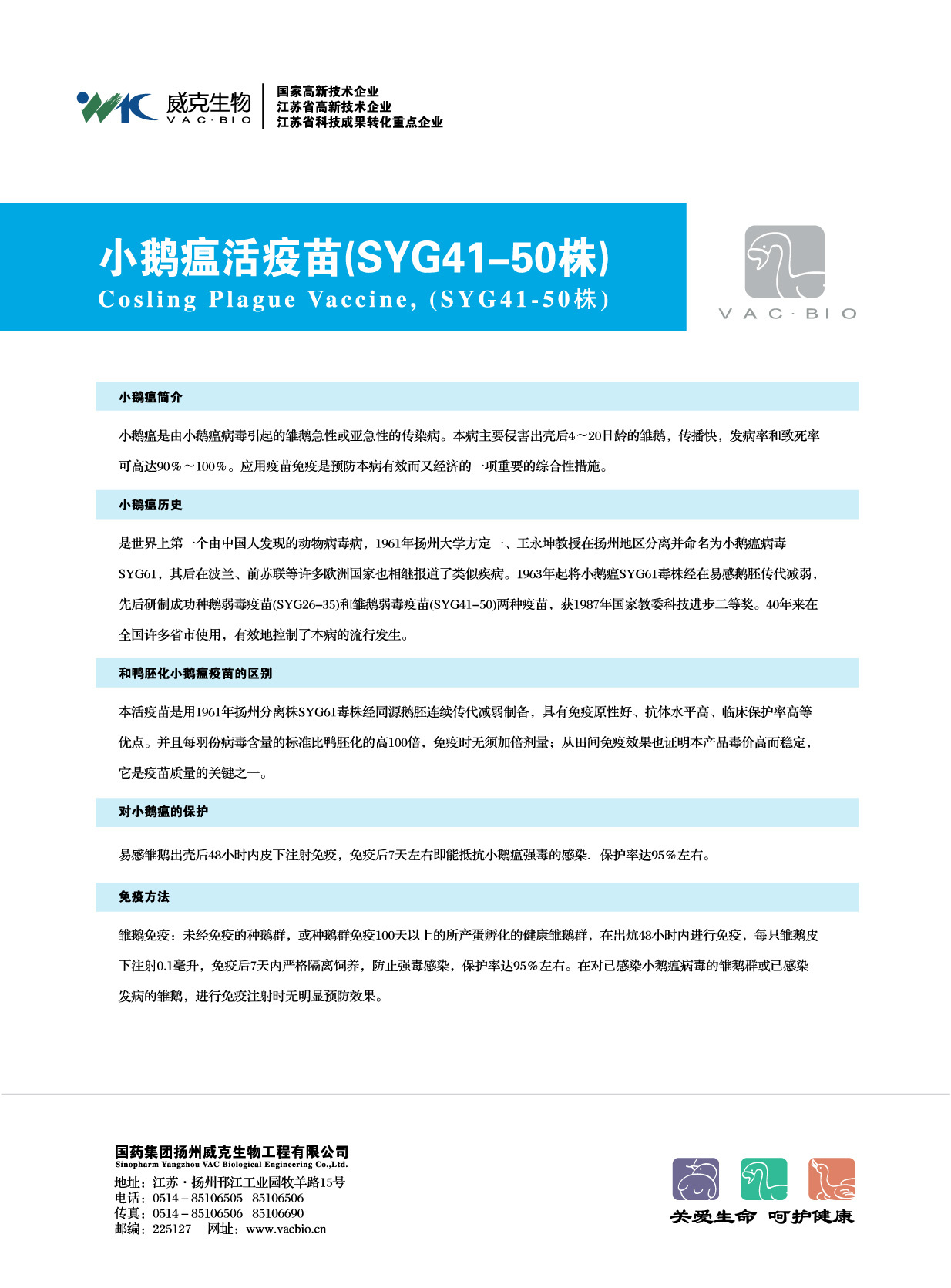【獸藥名稱】 小鵝瘟活疫苗(SYG41-50 株)