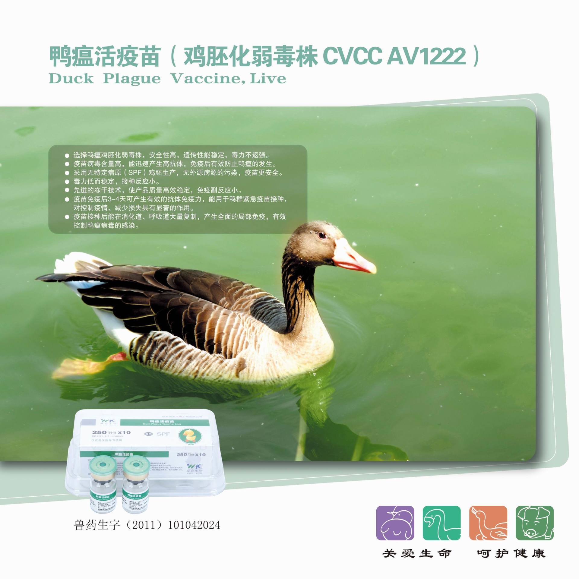 【主要成分與含量】 含鴨瘟病毒(雞胚化弱毒株CVCC AV1222),每羽份含組織毒至少0.005g。