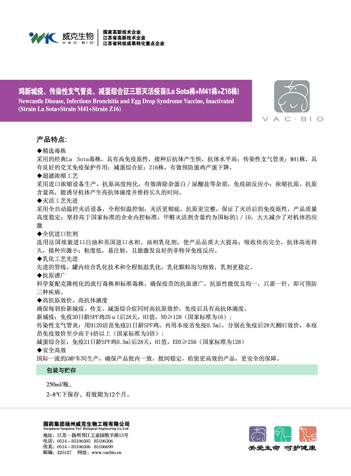 疫苗中含滅活的雞新城疫病毒La Sota株、傳染性支氣管炎病毒M41株和減蛋綜合征病毒Z16株,滅活前的雞新城疫病毒含量≥108.5EID50/0.1ml,傳染性支氣管炎病毒含量≥106.5EID50/0.1ml,減蛋綜合征病毒含量≥106.5EID50/0.1ml。
