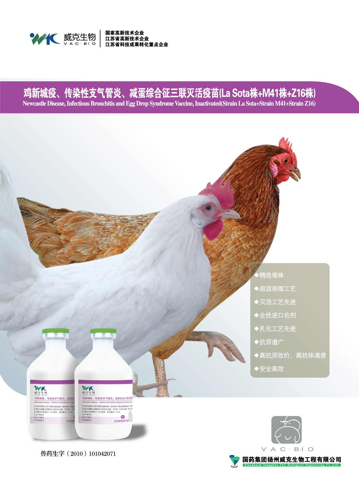 采用的經典La Sota毒株,具有高免疫原性,接種后抗體產生快,抗體水平高;傳染性支氣管炎:M41株,具有良好的交叉免疫保護作用;減蛋綜合征:Z16株,有效預防蛋雞產蛋下降。